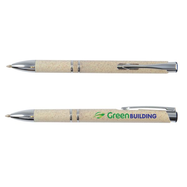 Push button ballpoint pen made from wheat fibre that is a renewable and biodegradable material. Optional black suede velvet pouch. Writing distance: 2.1 kilometres. TC roller ball. Nero pigment ink. Eco Crediential: 50% less plastic used in the manufacturing process and reuses the wheat fibre by-product.